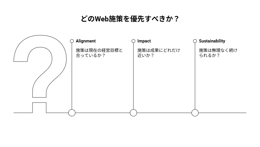 AISという判断軸:経営との整合(Alignment)、成果への近さ(Impact)、続けやすさ(Sustainability)。この3つを満たす施策から取り組むことで、無理のないWeb運用が可能になります。