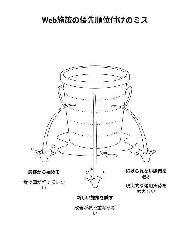 順番を間違えないことが重要:集客の前に受け皿を整え、次に改善、その後に必要な集客施策を選ぶ。この順番を意識するだけで、施策の空回りを防げます。